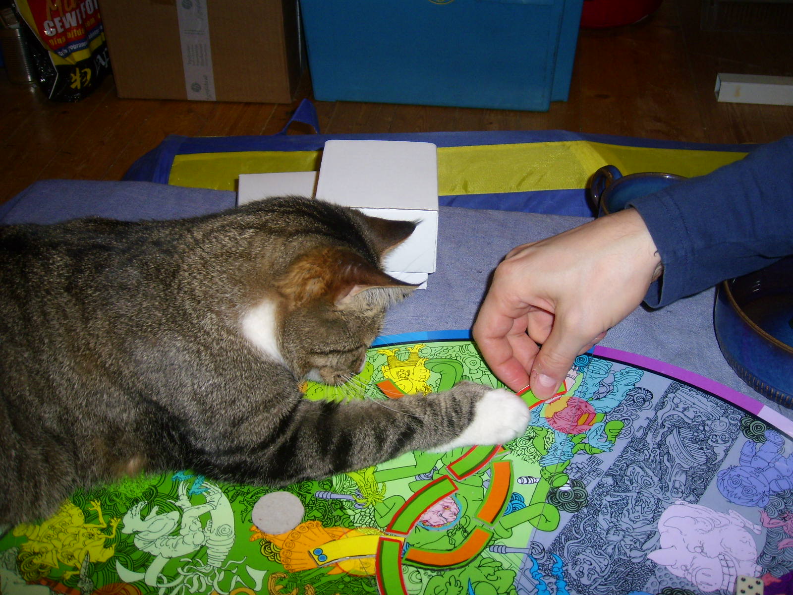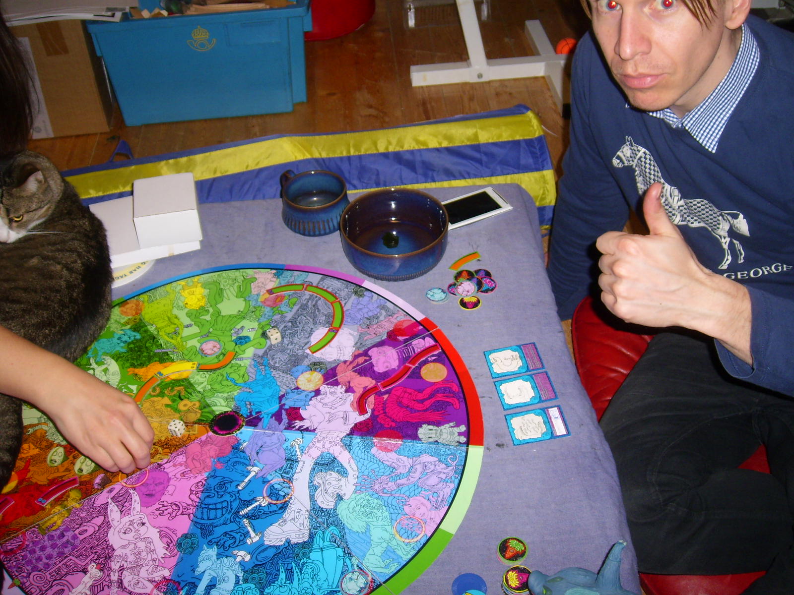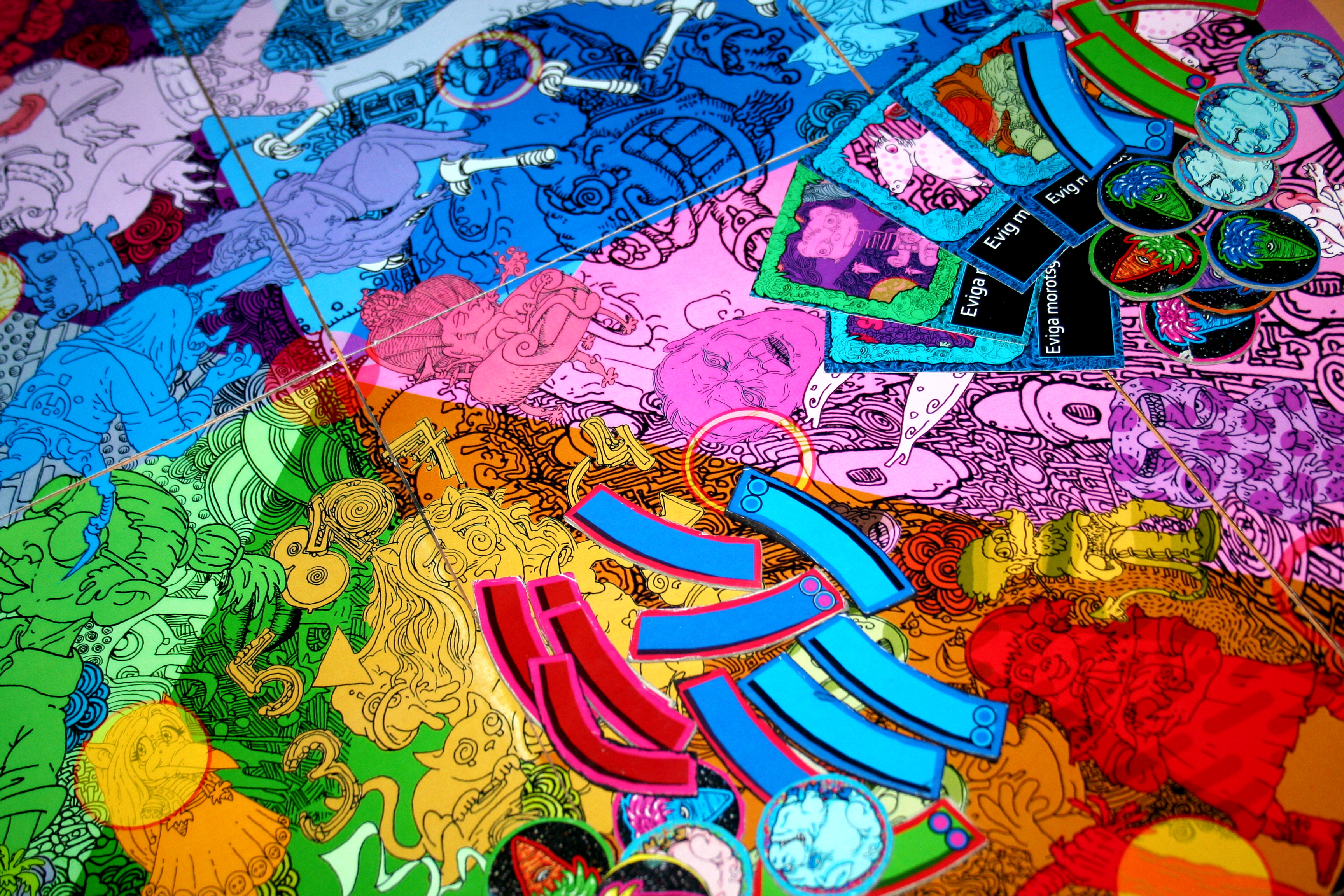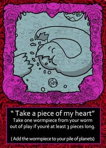 Aim of the game: each player starts with some worm parts and tries to eat as many planets as they can, and play out carrotcards/battlecards/”eternal carrot god” cards against each other. When all planets are eaten it´s time to kill of other players until there is only one left. When you destroy enemies you get some of their planets, when only one player is left it´s time to count who has most points. Count: eaten body parts, planets, and the length of the winner worm in play.