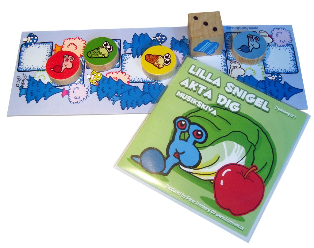 Dynamic childrens boardgame for 4 years and up Playing pieces are made of wood, and the gamemaps are of cardboard. The music cd contains 13 different version of ” Lilla snigel akta dig” performed by lots of different artists and in many genrés. Rules are available in: Swedish, German, Danish.