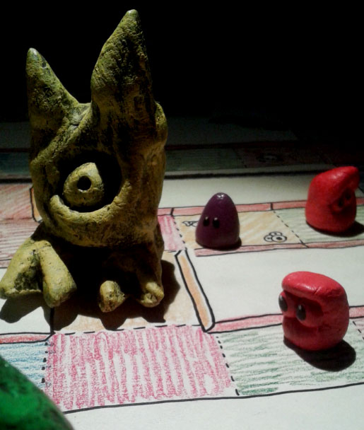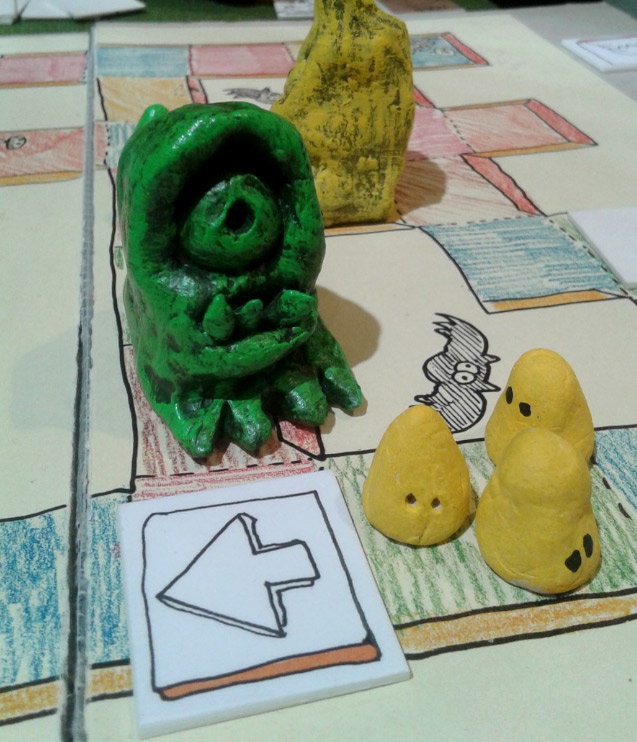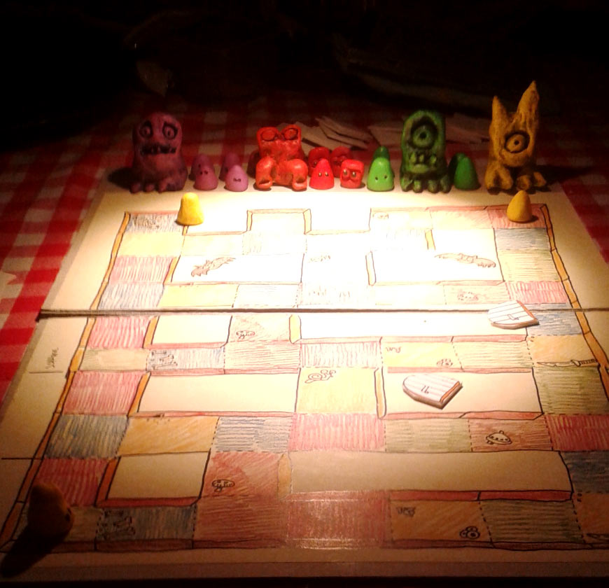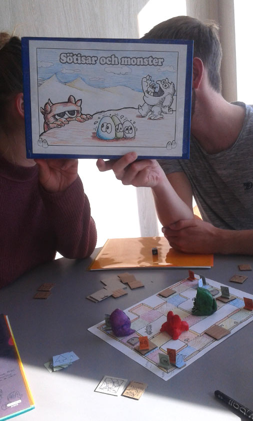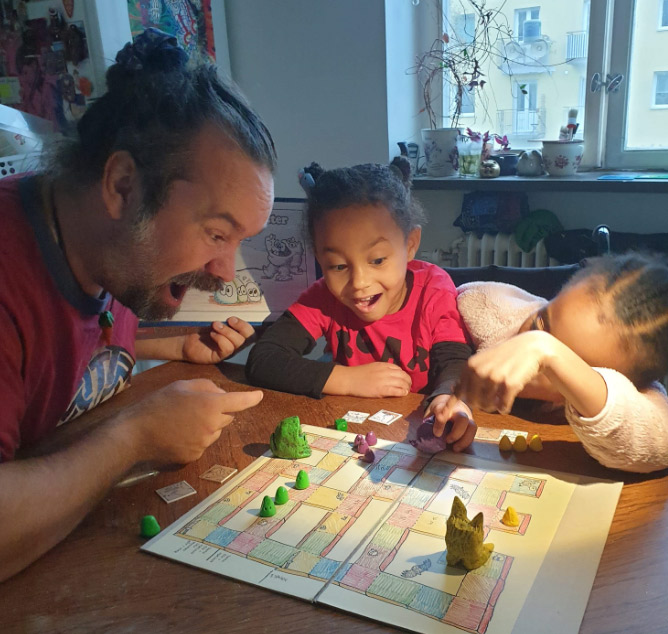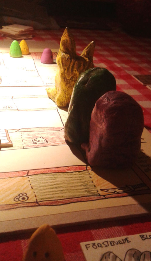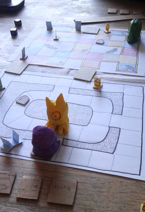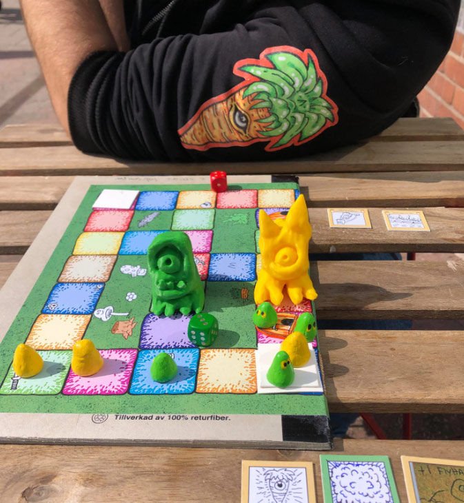 I feelt that I wanted to reach out to my friends over the globe and play with them so I then used my first papercut figures before I made clayfigures and then later on 3dprinted instead and arranged them in layers together with the cards with the boardgamemap in photoshop. I haven´t heard of anyone doing this way of playtesting but I think it´s very practical because you can just share your desktop over zoom,messenger or other media and invite your players. They only need a a dice and a microphone to participate ( and perhaps a bit honesty with the dicerolls if that´s important 🙂 )