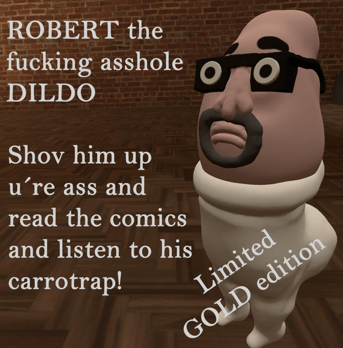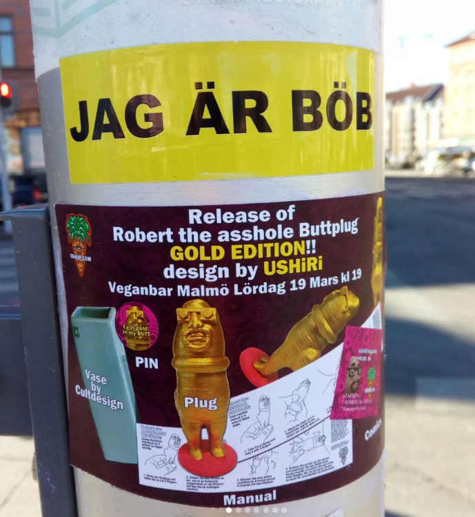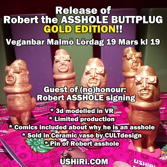 Robert the asshole is based on my asshole friend Robert. He is a big dick and an ass. I first made a comics about why he is an asshole 2019. Then later on when I was developing my cute tactical game named “Sötisar och monster” / “Cuties and monsters”. I showed him the cuties and he said the more looked like “uglies”. Later on that evening I thought more and more about it and feelt wow Robert you are really a fucking asshole, So I feelt like “Robert you are a fucking uglie, a real fucked up uglie!!” and I first wanted to make some new game components for my “Cuties and monsters” but with Robert as a monster with some mall Cuties that looked like Robert and then instead would be renamed “uglies” based on his irritating looks”. Suddenly I was creating a body unconsciously and after a while I feelt “Hey Robert look like something you have shoved up your ass” because its irritating and itching to have him around you. Then the idea took form aaaah….Robert is an ASSHOLE buttplug…YEAH!! It took some time to find the correct vases and then I decided to do a manual with technical illustrations of how he should be used and I feelt its not enough with only make it in english so I had to do a german translation of it aswell.
